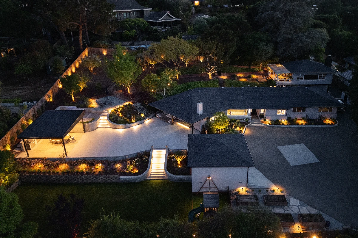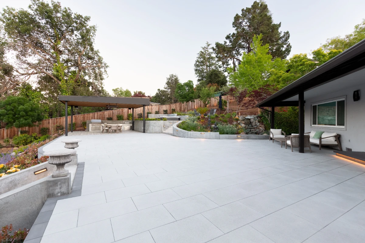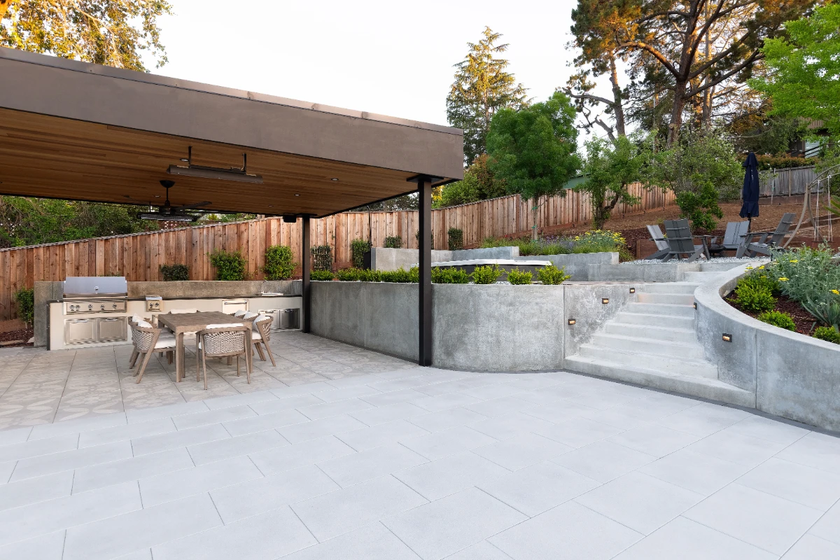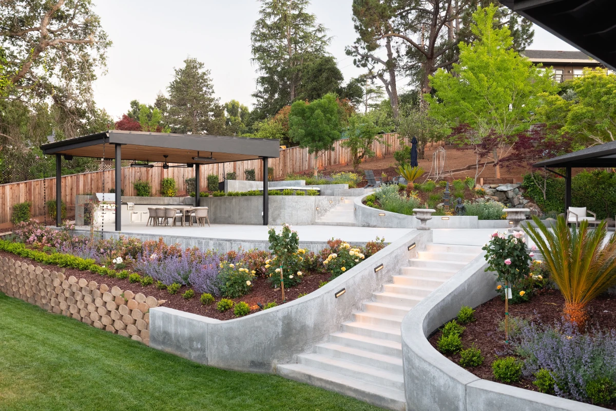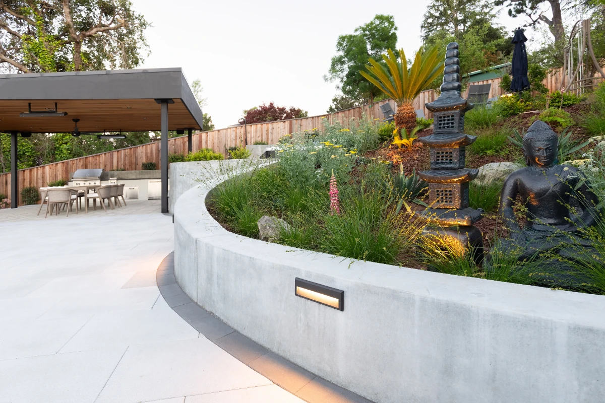 Along with the patio, a 20’ outdoor kitchen finished in smooth white stucco offers a central hub for cooking and dining. Multiple retaining walls were constructed to elevate sections of the yard and create level areas for different activities, giving the landscape a sense of structure and flow.