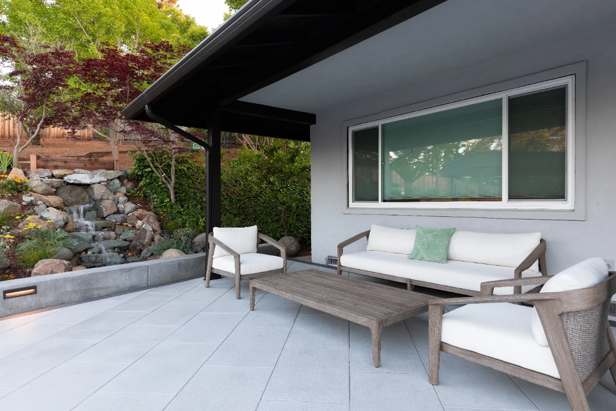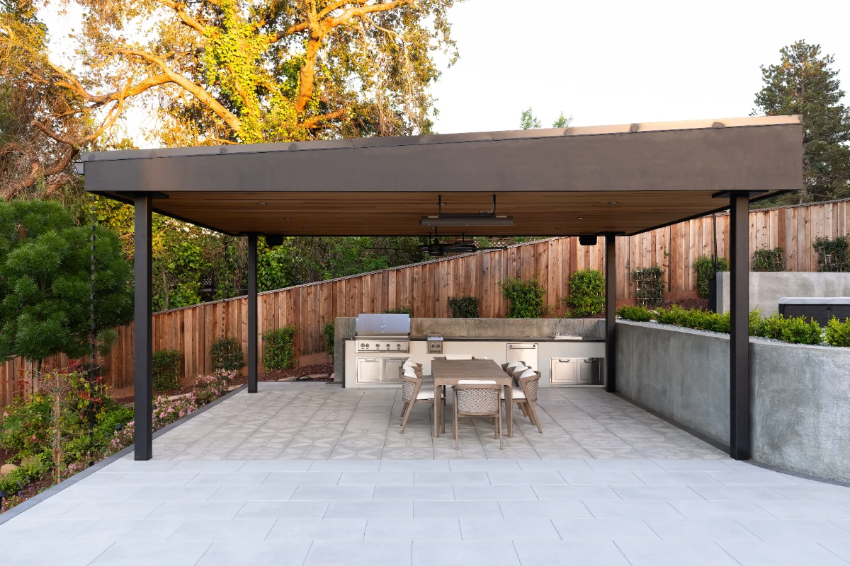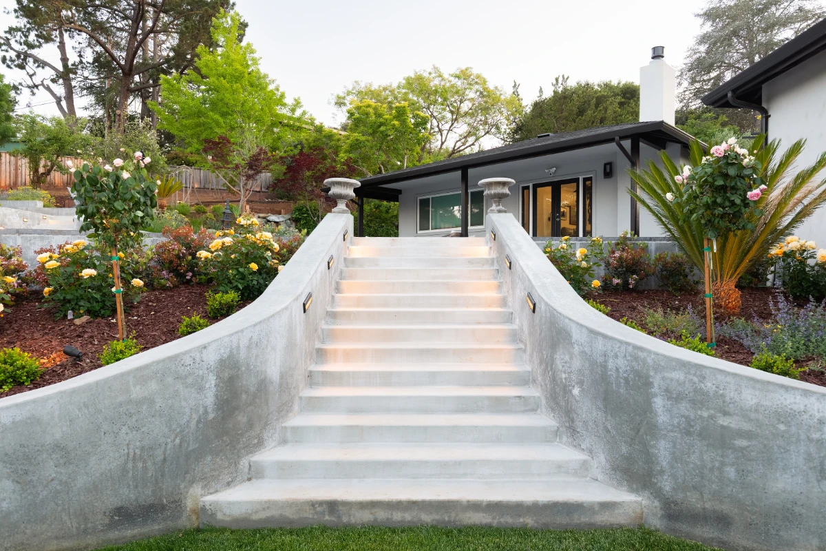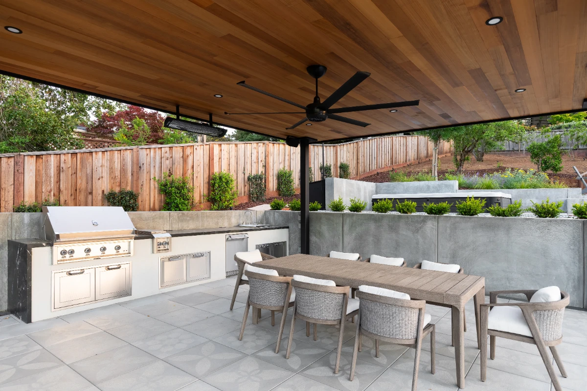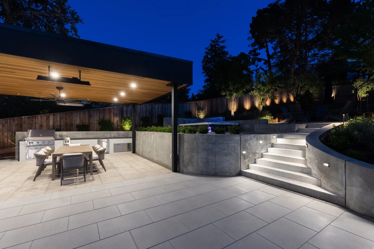 Along with the patio, a 20’ outdoor kitchen finished in smooth white stucco offers a central hub for cooking and dining. Multiple retaining walls were constructed to elevate sections of the yard and create level areas for different activities, giving the landscape a sense of structure and flow.