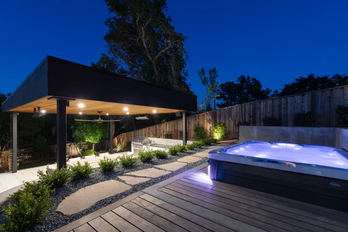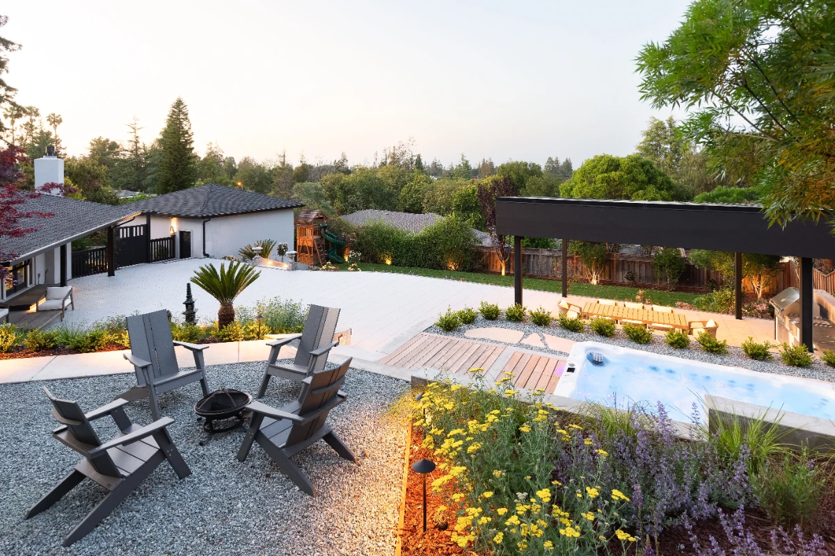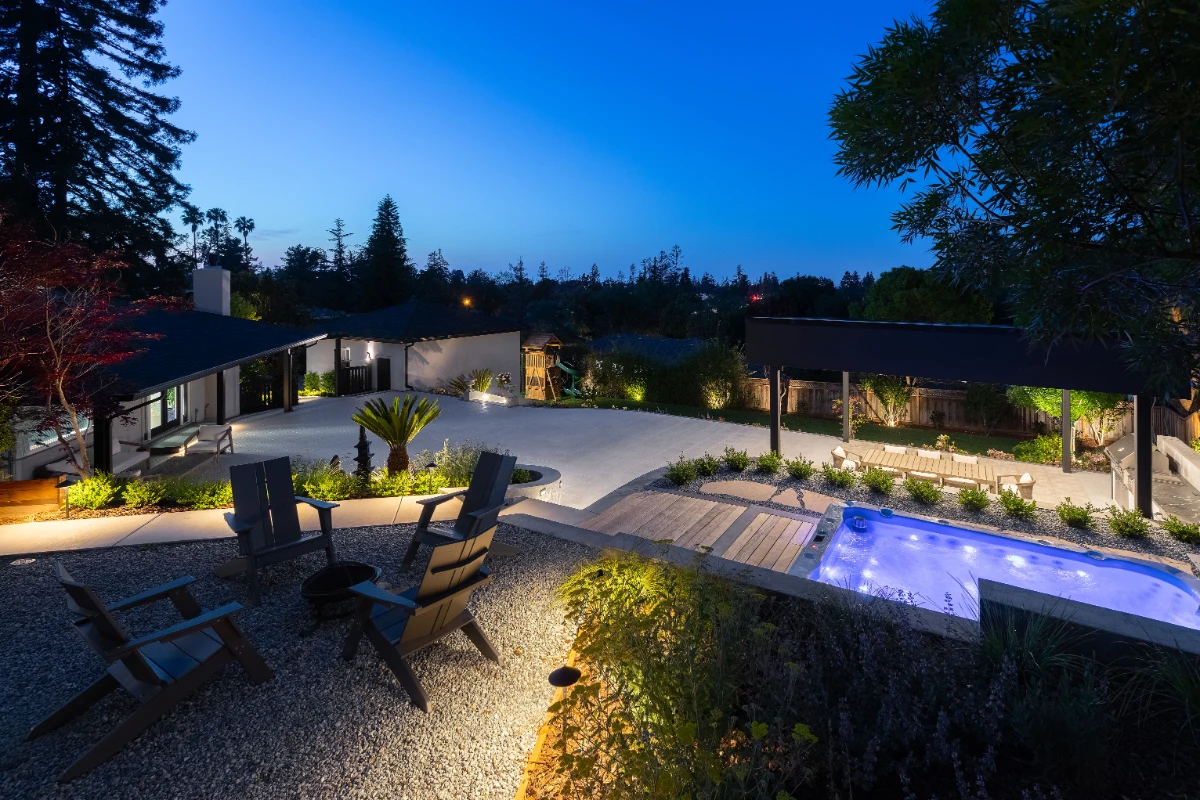 A cozy fire pit area and spa deck provide spaces to unwind, while the lower level features a grass lawn and a dedicated playground for the kids. Flagstone pathways connect the different zones. This backyard is designed to function on multiple levels, offering a blend of activity, relaxation, and visual appeal for the whole family.